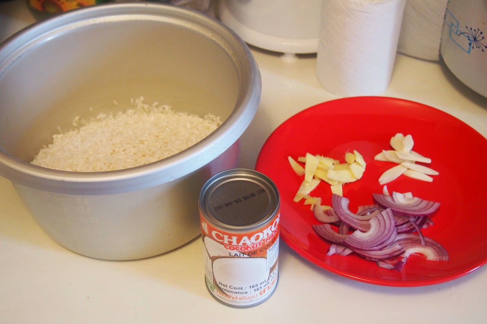 2) Kemudian, masukkan bahan-bahan yang telah dihiris (bawang besar, bawang putih dan halia) ke dalam periuk nasi yang mengandungi beras